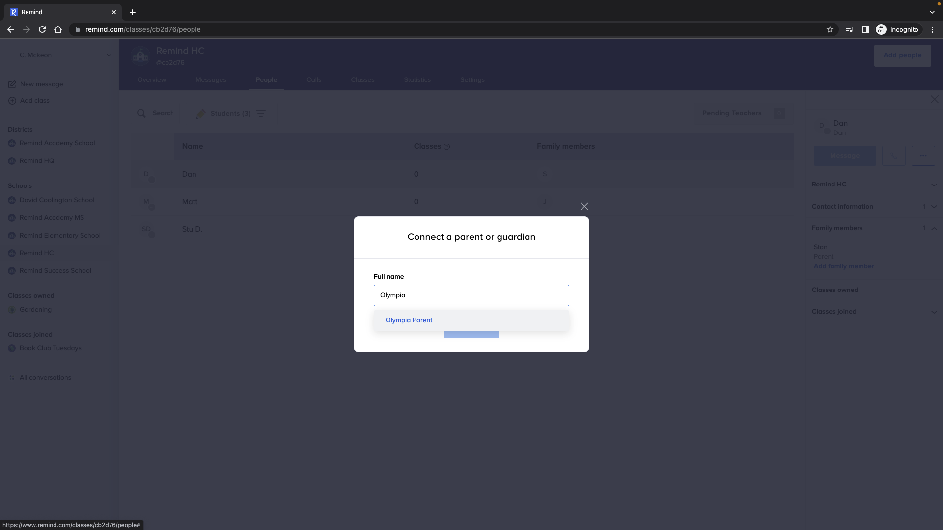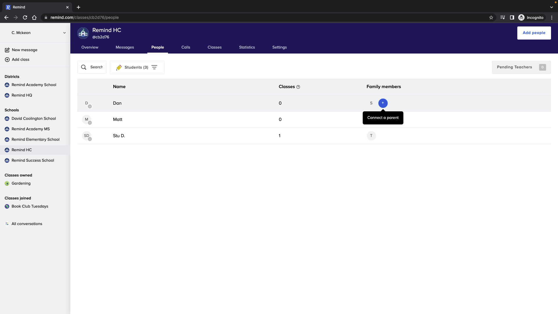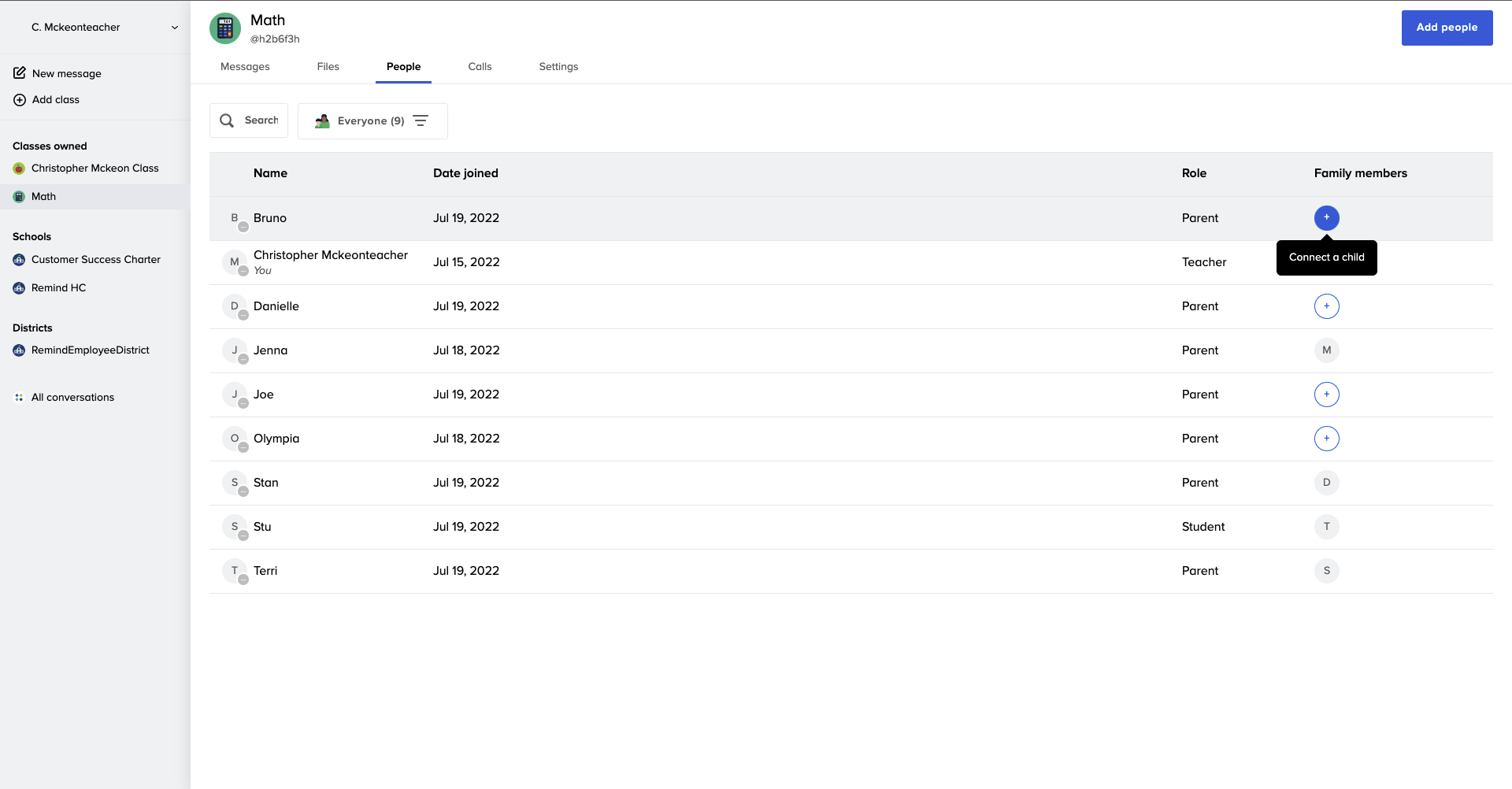 - Hover your cursor under the Family Member column for a student or parent. Click Connect a parent or Connect a child.