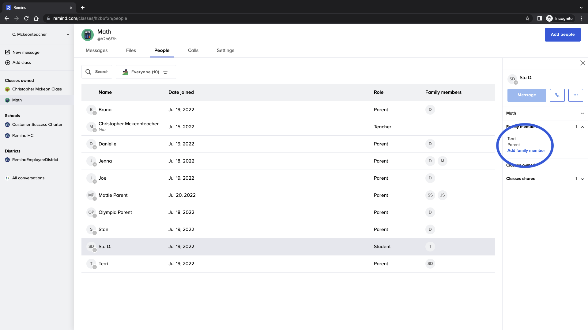 - Hover your cursor under the Family members column for the student or parent you need to add a family member to their account.