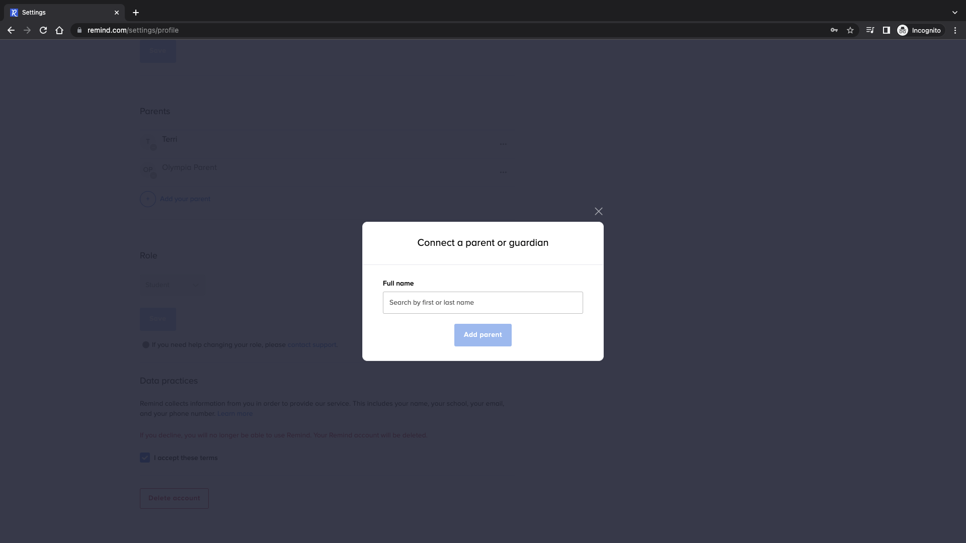 - Click Add your child or Add your parent. A pop-up will appear with a field to add your family member.