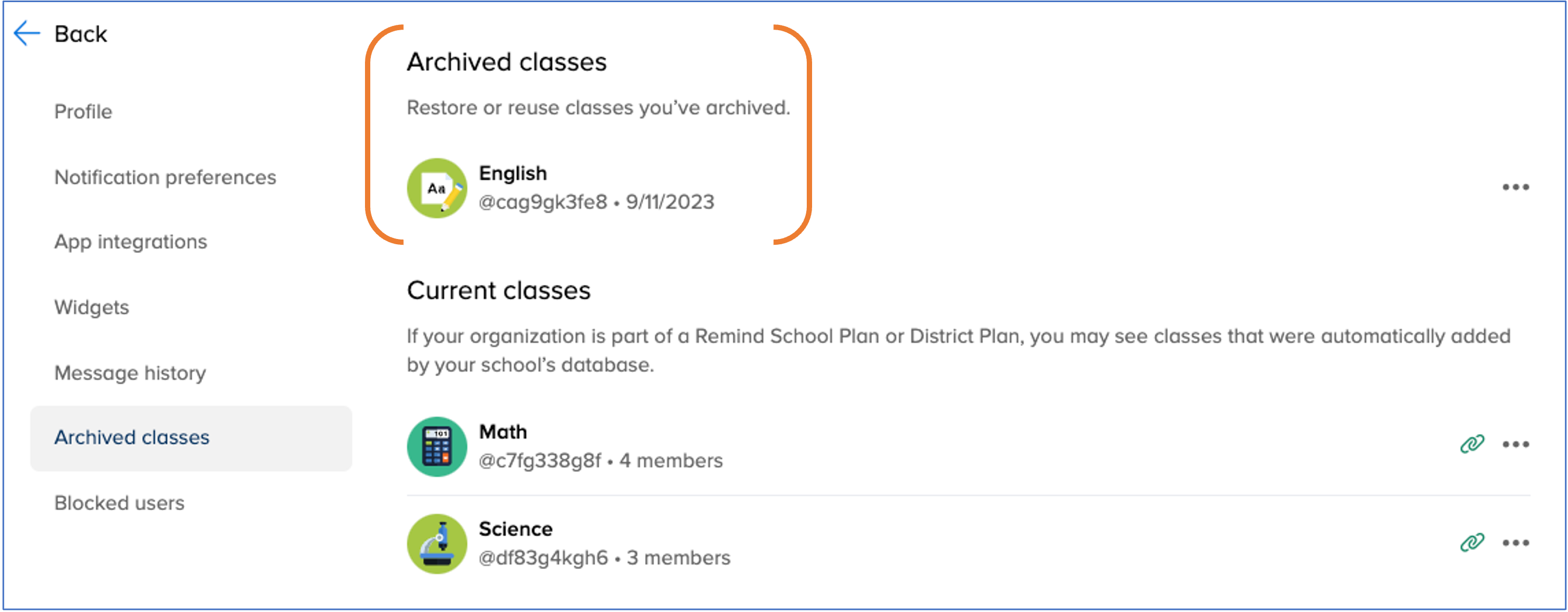 • Classes to be Archived - A list of inactive classes your school no longer shares with Remind. These classes will automatically be archived when you access your Remind dashboard. You can click the three dots to unarchive them, or you can restore your archived classes via Account settings -> Profile -> Archived classes at any time.archive class list.pngarchived list.png