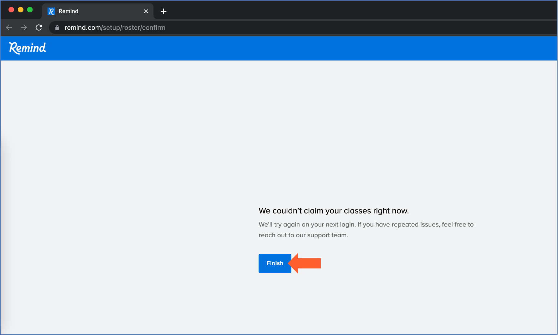 • If you log in to your Remind account to claim your new classes and see an error message, as shown in the image below, click Finish to access your Remind dashboard. You can use Remind as usual and send announcements to the classes you already own or co-own. Typically, the issue you're experiencing will resolve the next time you log in to your account.