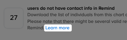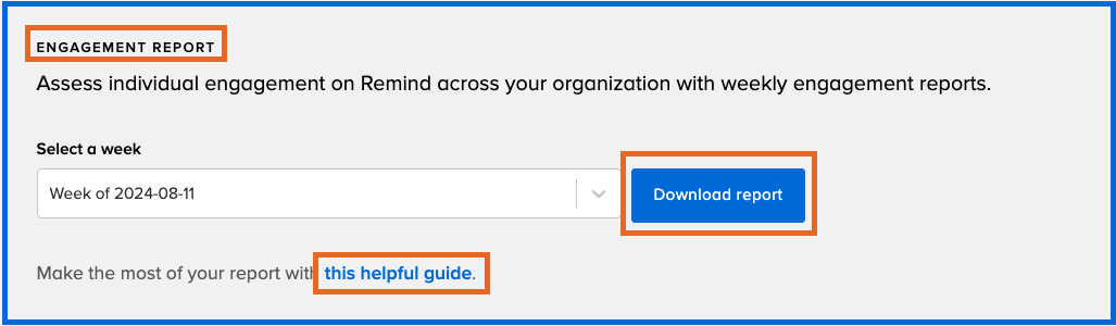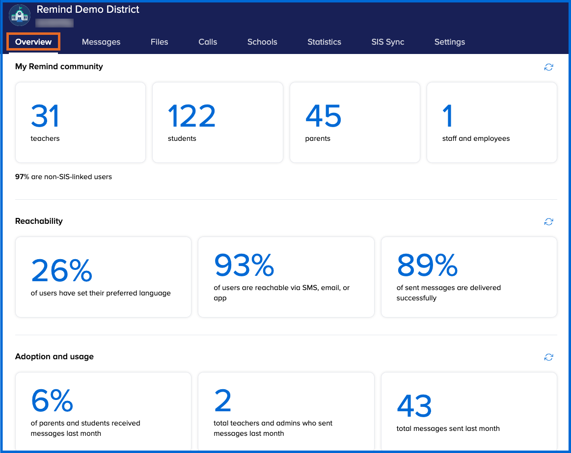 We recommend monitoring the level of engagement across your community periodically to help your teachers, parents, and students increase their use of Remind, improve their two-way communication, and ultimately reach your organization's communication goals. Review this data to see: