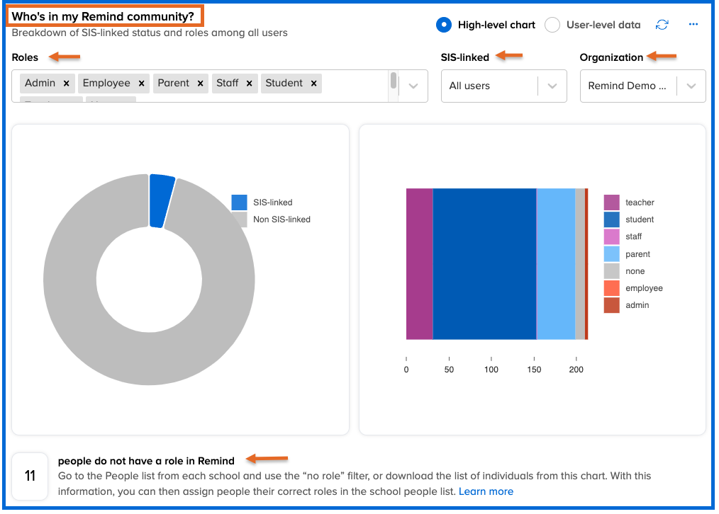 - Donut chart - see the % of people in your organization(s) who are SIS-linked or non-SIS-linked.