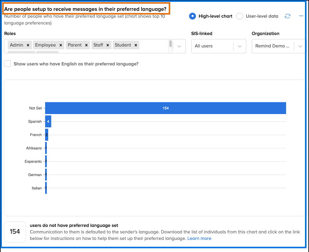 You can send district- and school-wide announcements to people in their language of choice. This chart will show how many people in your community have a Remind account set to receive messages in a specific language. The chart shows data for up to ten language preferences.