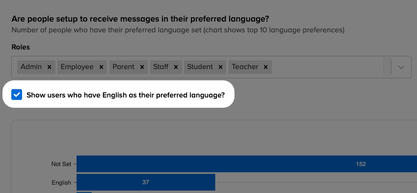You can filter the preferred language data by Role, SIS-Linked status, and School.