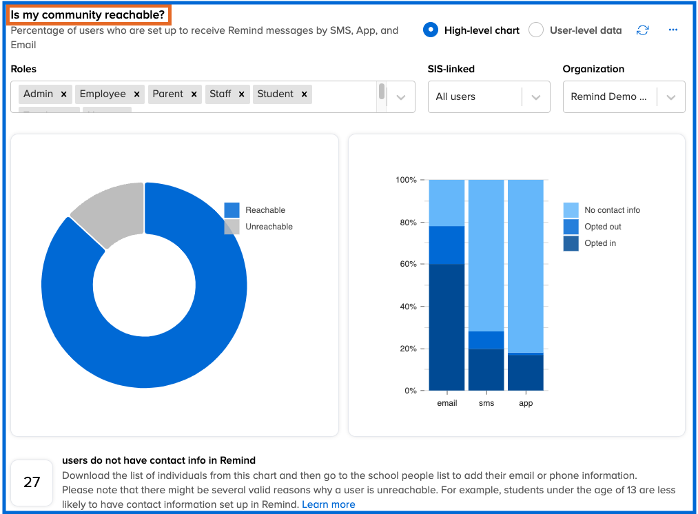 - Donut chart - the number and percentage of "reachable" people, meaning their account is set up to receive messages on a valid device in Remind.