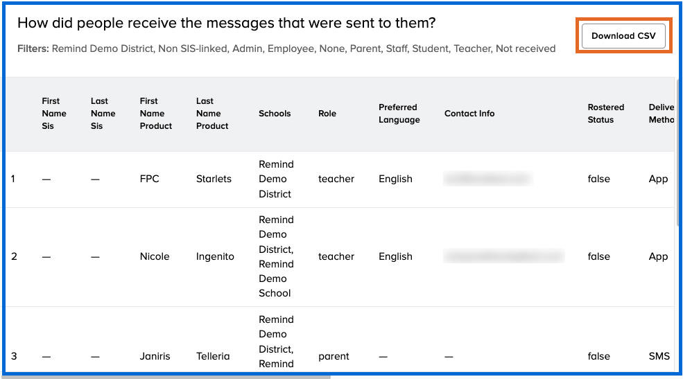 To ensure your district or school participants can receive your announcements, please check that they are set up to receive messages via email, SMS, and/or app. You can filter the reachability data by Roles, SIS-Linked status, and School.
