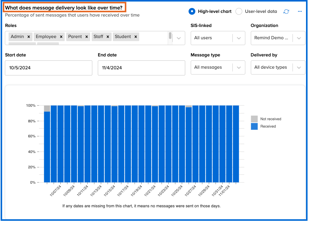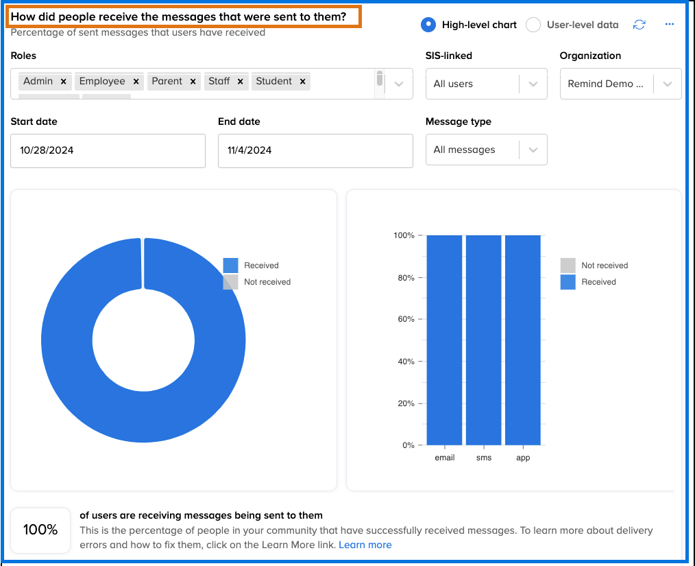 Review your organization's messages received data to check that your announcements are being delivered to your community. You can filter the data by Roles, SIS-Linked status, School, Date Range, and Message Type (all, chats, announcements).