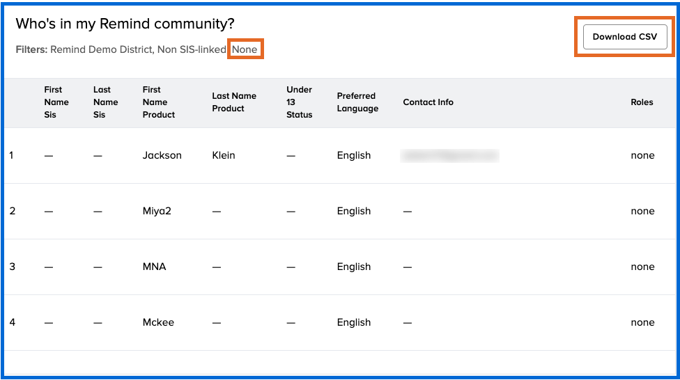 You can learn more about who is in an organization by filtering your community members by their Role and SIS-linked status. District admin can also sort by Organization (schools). You can select more than one option for each filter. This view allows you to safeguard your community as you can ensure participants are in the correct organization with the proper role.