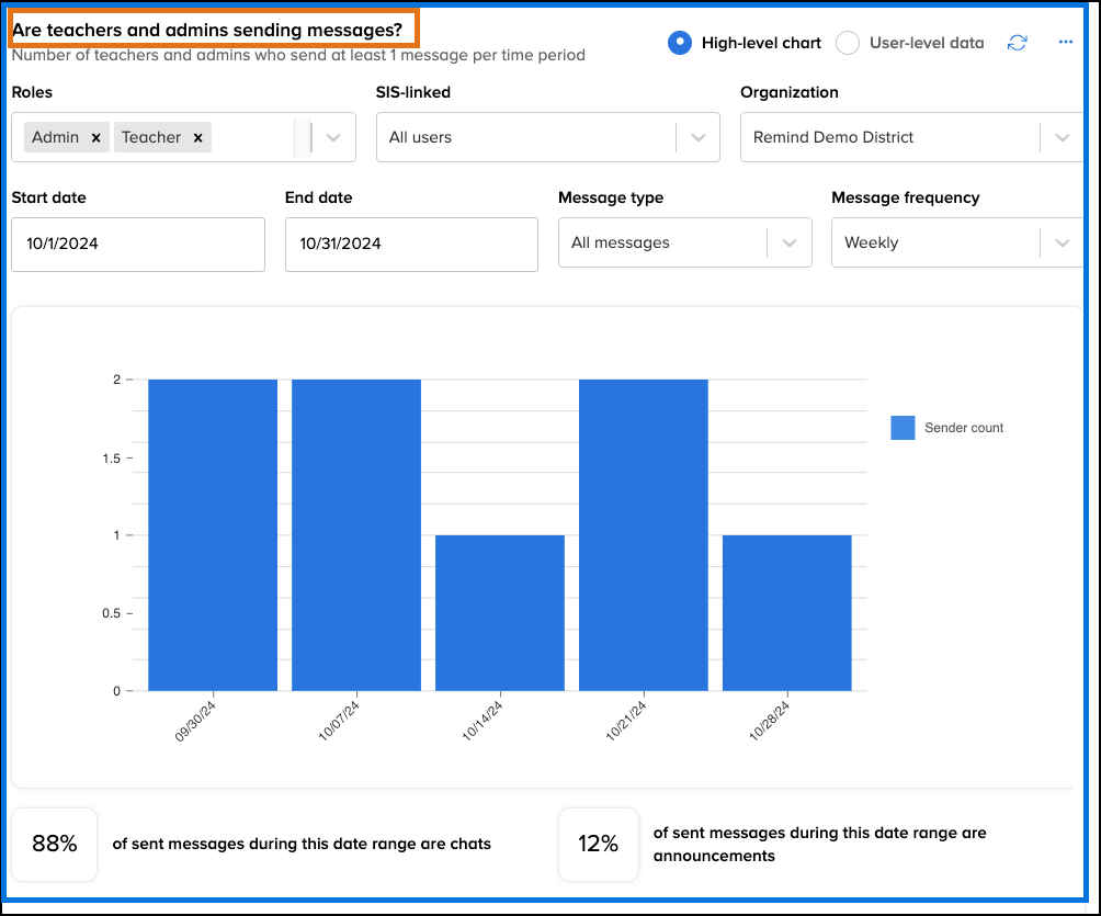 The more your teachers and administrators use Remind to share important messages with parents, students, and staff, the more involved these community members will become. Periodically check to see how many teachers and admins are sending messages. This will help you figure out when these important stakeholders need help and encouragement in increasing their communication so your organization can reach its engagement goals.