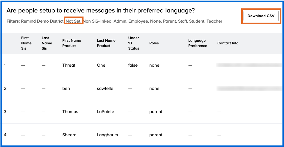 To see who doesn't have a preferred language set, click on the blue bar next to "Not Set." You can see the list and Download CSV.