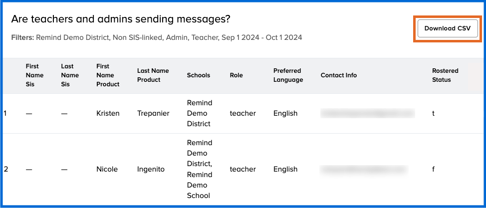 Hover over a chart to see the total number of messages sent. Click the bar graph to see a list of teachers and admins who have sent messages, and Downoad CSV if you wish.