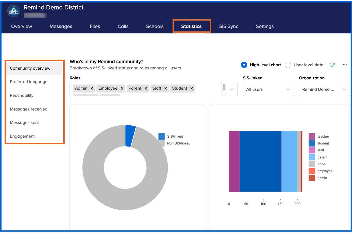 If you click on any of the statistics in the Overview dashboard, you'll be taken to the Statistics page, where you can obtain detailed information about the breakdown of the roles in each school and the SIS-linked status of the community members.