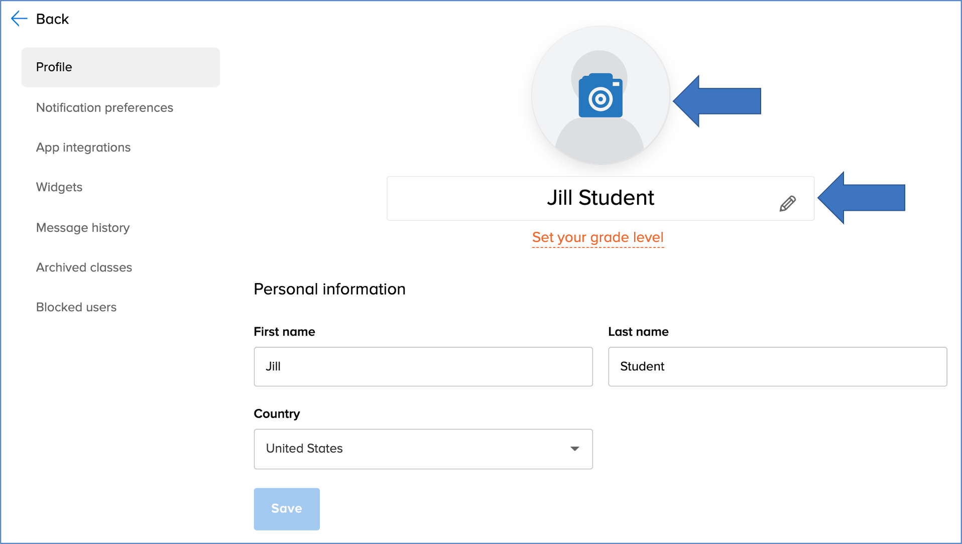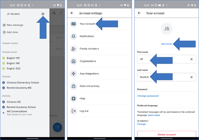 - Click on the camera icon to add a photo your Remind account, and click the pencil to edit your First and Last name. You can also edit the Country associated with your account under the Personal information section.