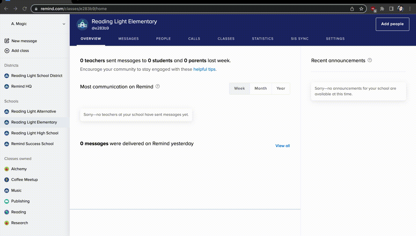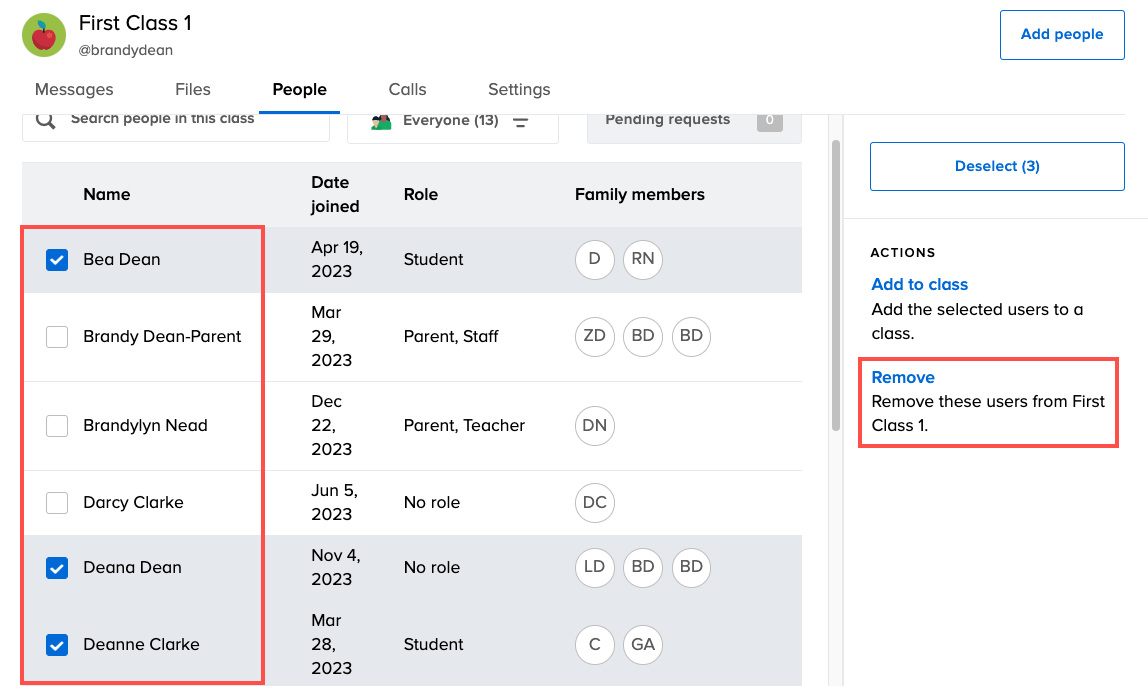 Note: The People list for classes created by the district via SIS Sync is managed automatically. If you need to remove someone from a rostered class, please reach out to your school administrator. When you remove a participant, Remind will send them a message notifying them of their removal.