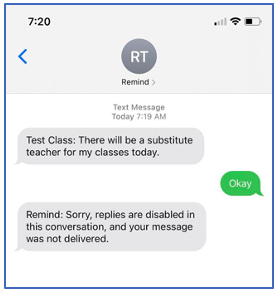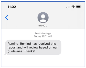 Once the report has been placed, you'll receive a notification from Remind. The sender will not see your @report response, and will not get notified that you submitted the report.