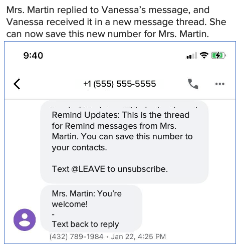 Trust and safety is extremely important to us at Remind. One way we protect our users is by not allowing the exchange of personal information on our platform. Everyone's personal cell phone numbers are shielded. To give you the ability to send mass communications while simultaneously sending individual text messages, we assign you a unique Remind phone number for each person you message. For example, if you have thirty participants in your class, when you send a class announcement, each participant will receive your message from a different Remind phone number. When you send a participant an individual message, they'll receive it in the same text thread as your class announcement. This means each participant only has to save one unique phone number for you on their phone.