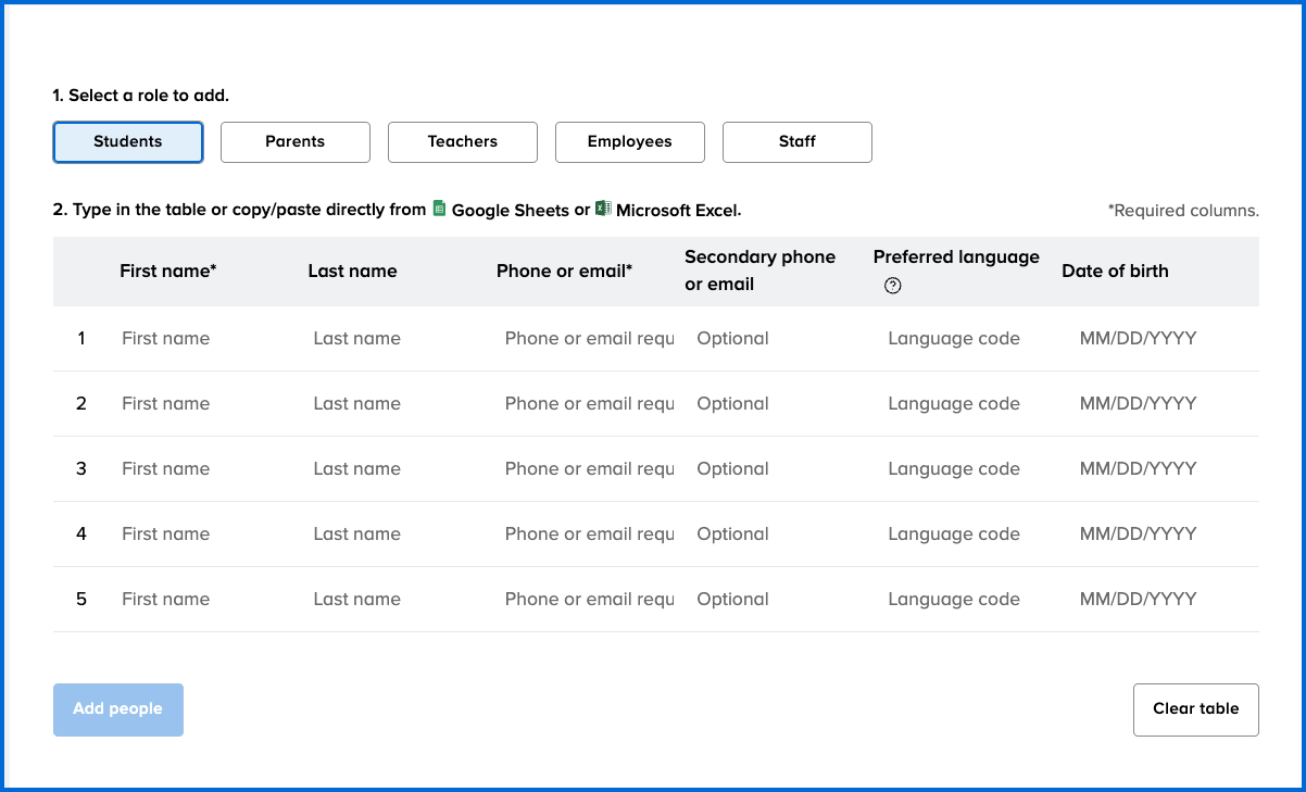 Enter their first name, last name (optional), phone or email address, secondary phone or email (optional), and preferred language (optional) in the respective columns. For students, you can also add the date of birth.