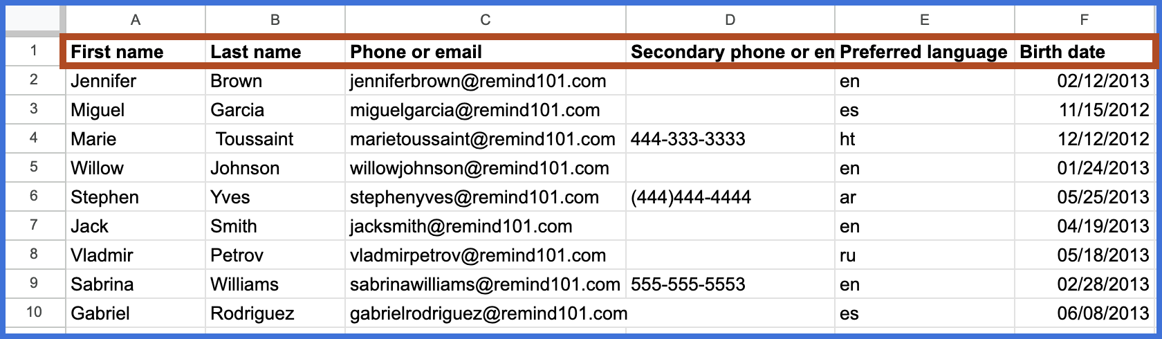On the Students tab, enter the first name and last name (optional) of each student in the first and second columns, respectively. Then enter their phone or email address in the third column, second point of contact in the fourth column (optional), their preferred language in the fifth column (optional), and date of birth in the sixth column (optional but strongly recommended).