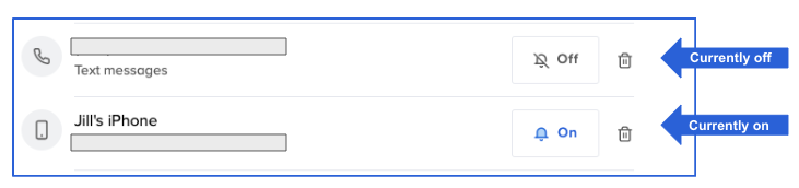 - Review your Notification settings and enable the device you want to receive messages as the blue bell indicates. A gray icon means the device is turned off and will not receive messages.