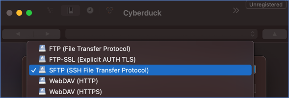 4. From the dropdown menu in Cyberduck, choose SFTP (SSH File Transfer Protocol).Set_up_file_transfer_5.png