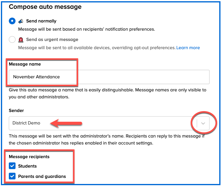 1. Confirm the Message name and Sender, and select the Message recipients—students, Parents and guardians, or both.
