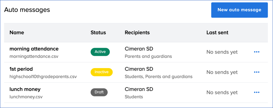 On the Auto messages dashboard you’ll see a list of Active, Inactive, and Draft auto messages.