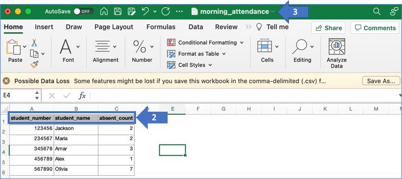 1. Save your file as a CSV with a unique name. We recommend using the same name used in step 6 above. Ex. numberofabsences.csv, lunchbalance.csv, 5thgradeannouncements, highschool10thgradeparents.csv.export_CSV_2.png