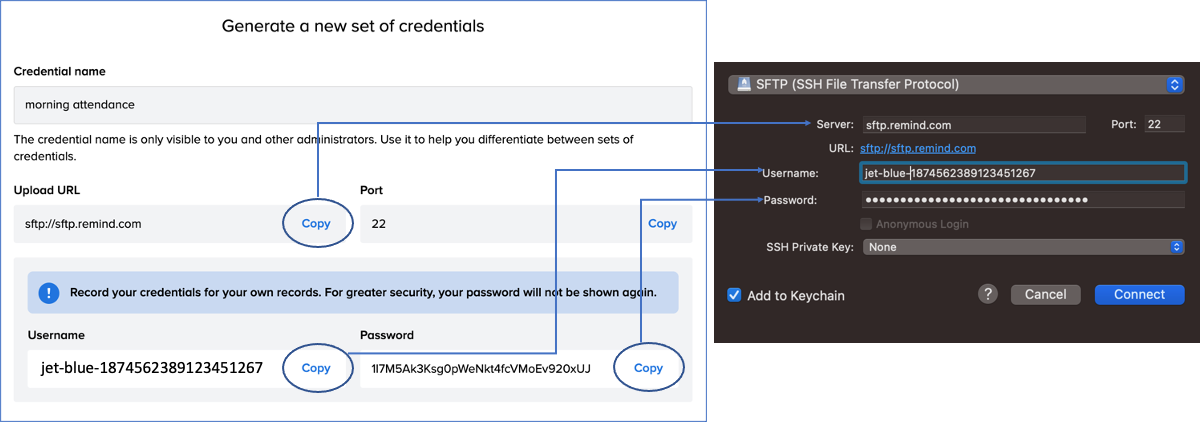 5. Go back to your Remind credential window and copy the information for each section into the window in Cyberduck or within your SFTP credential application.