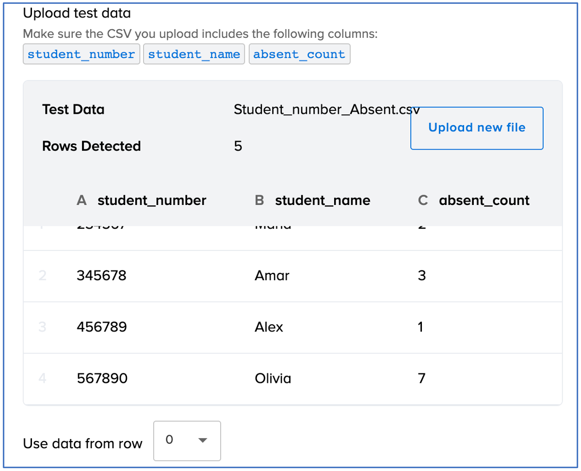 In the example above, we added a new column in the CSV file with the header student_name because we want the auto message we send to include their first name. This particular auto message is about attendance so we added a third column with the header absent_count, which will provide the number of times a particular student has been absent.