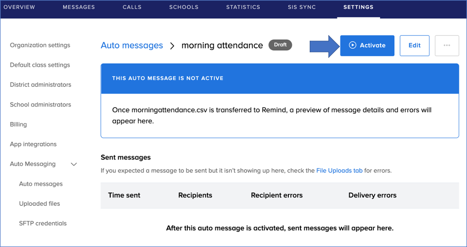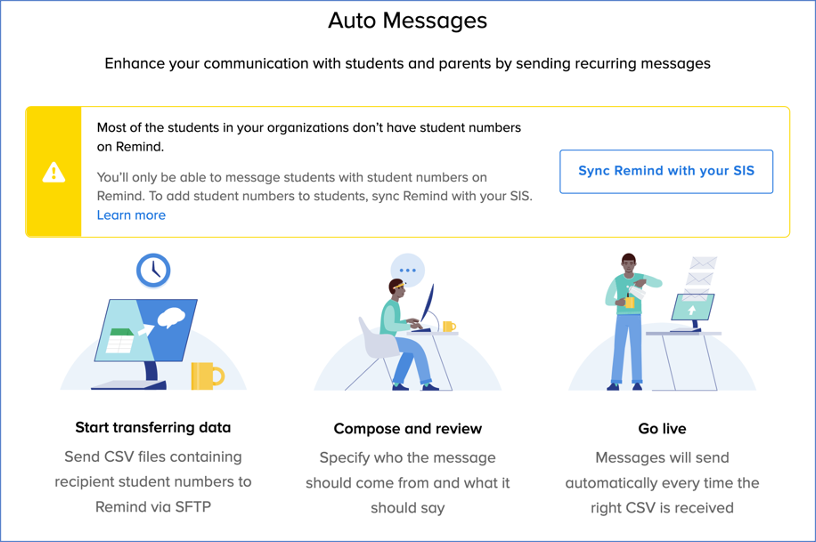 For administrators with advanced messaging, a premium feature available with Remind Hub! On the web only. Your organization must complete SIS Sync set up prior to sending an auto message. To learn more, please contact your Customer Success Manager or Remind support.