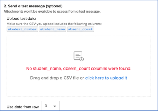 Make sure that every student number has a corresponding custom field in your CSV. If a student number is missing a custom field, the message will be sent with the CSV custom field name in place of personal, customized information, or you’ll see the no student_name, absent_count columns were found in the error message