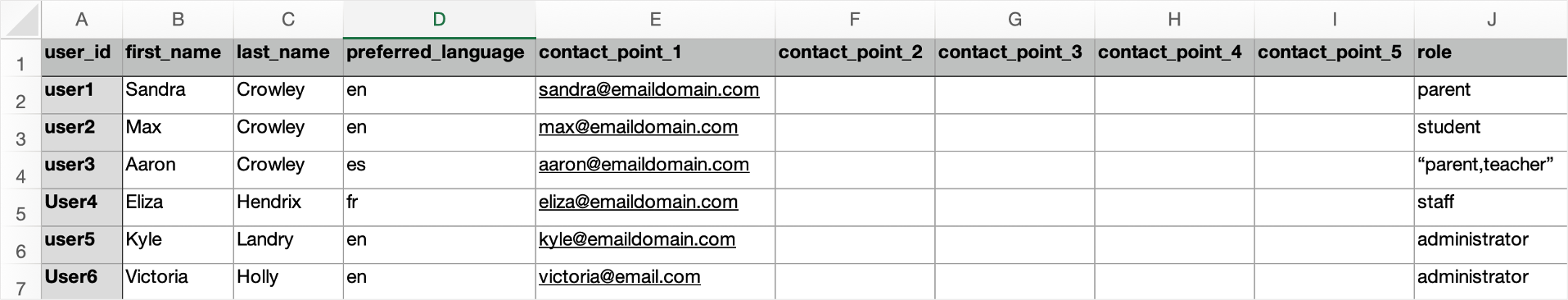 - Messages that users receive will be translated into their preferred language. If the preferred language is updated by the user, teacher, or administrator, it will take precedence over the data in the CSV file.