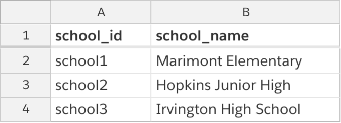 - There must be a unique ID for every school in the district; the file cannot contain multiple schools with the same ID.