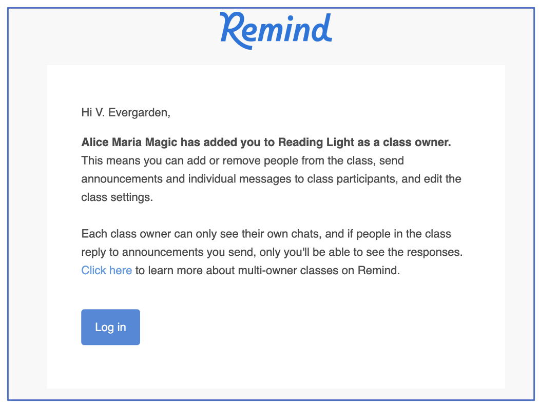 - At the moment, you cannot remove co-owners from a class. If someone no longer wants to be a co-owner, they must log in to their Remind account, and follow the steps above to remove themselves.