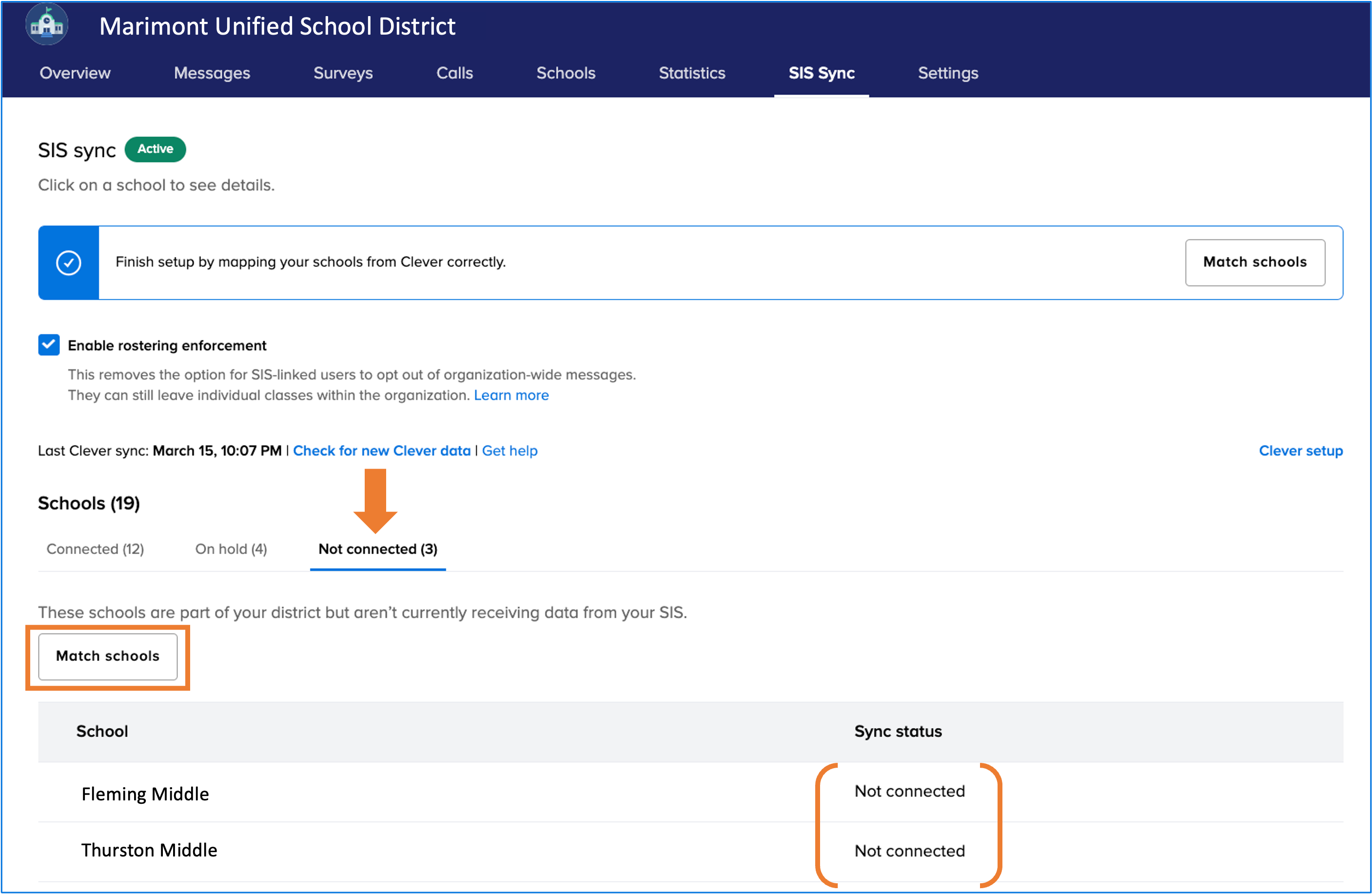 You may have schools in your district that are not sending data to Remind. If this is intentional, you don't have to take any action. If you need to connect a school, you can click Match schools and follow the prompts on the page to share the school's data with Remind.