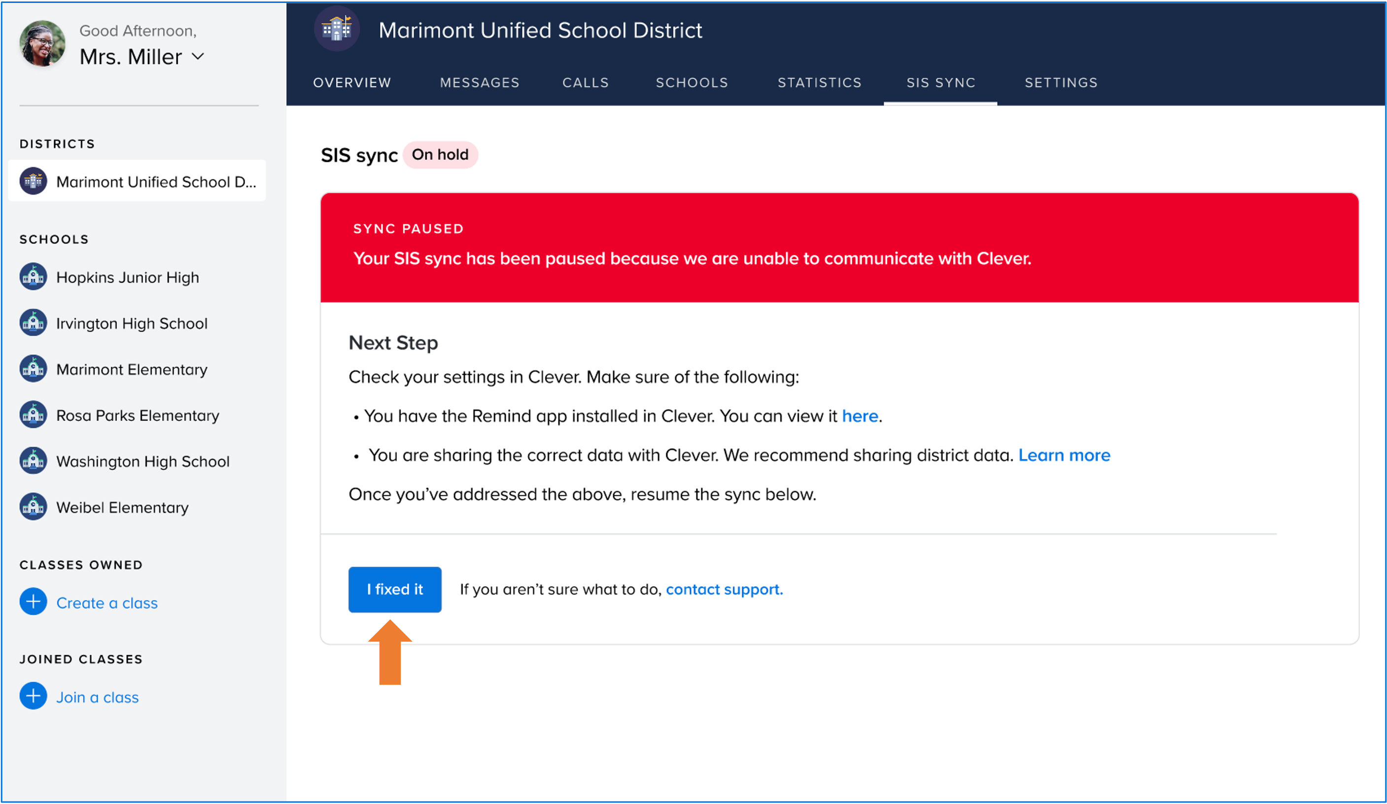 - Once you've addressed the above, click I fixed it on the school's SIS sync report. Remind will attempt to reconnect with Clever and process the sync immediately.