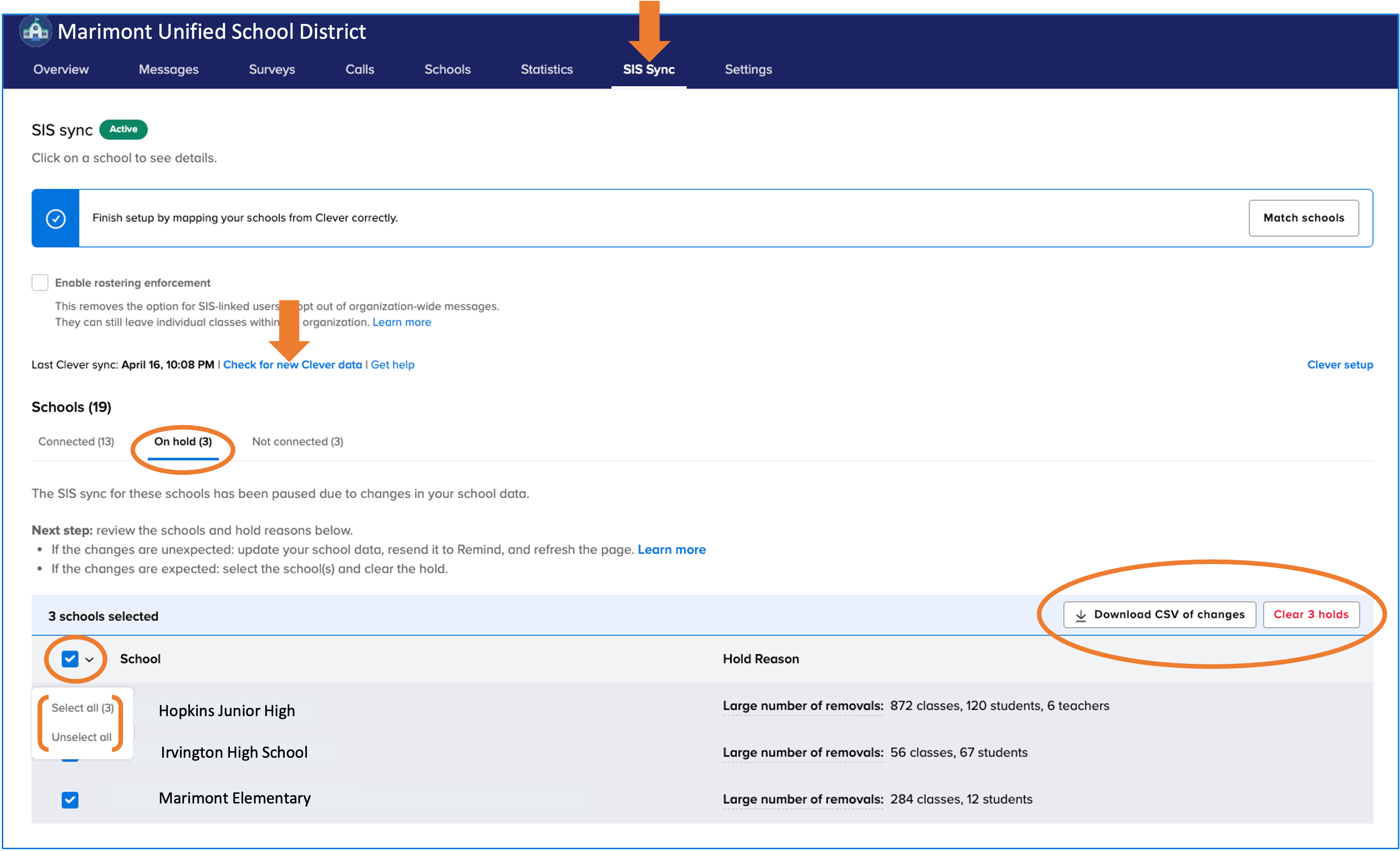 Although you can release holds on each school's SIS sync dashboard, we recommend doing so from the district level because you can view all the schools at once and take action for one or more schools simultaneously.