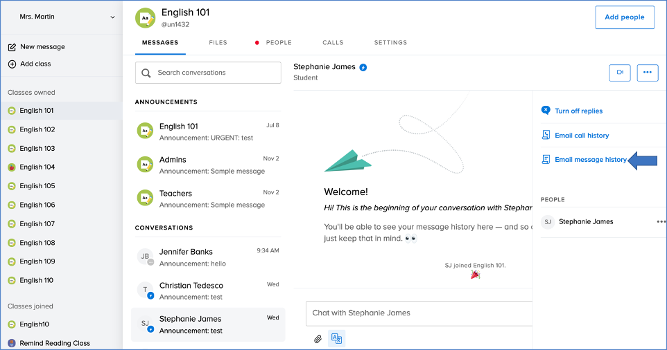 - On the Messages tab for your class, click on the name of the person whose message history you need.