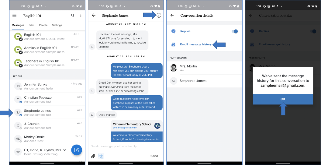 Make sure there is an active email address linked to your Remind account as we'll send the message history to your email.