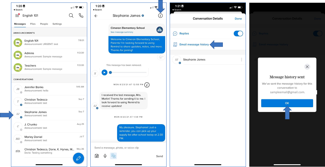 You can easily export the message history for an individual conversation via your Remind account online or through the Remind app. The message history link will expire after 90 days.