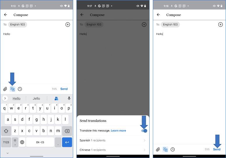 Once you've set everyone's preferred language, you can easily enable preferred language translation in your message composer to send auto-translated district and school-wide messages via web, app, or SMS at any time. If you currently have replies enabled, when community members use the translation feature to respond to you via the web or app, their message will automatically translate into your language upon receipt. Auto translations is also available for SMS users whose account are connected to an organization with the Remind Hub.
