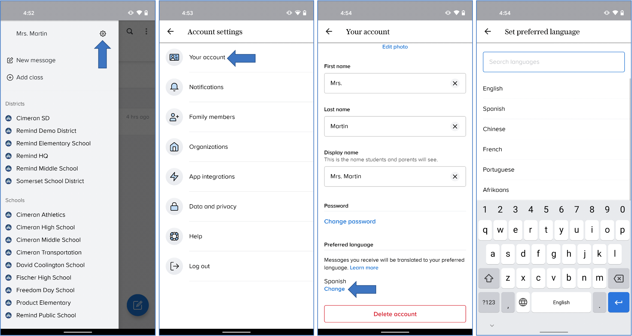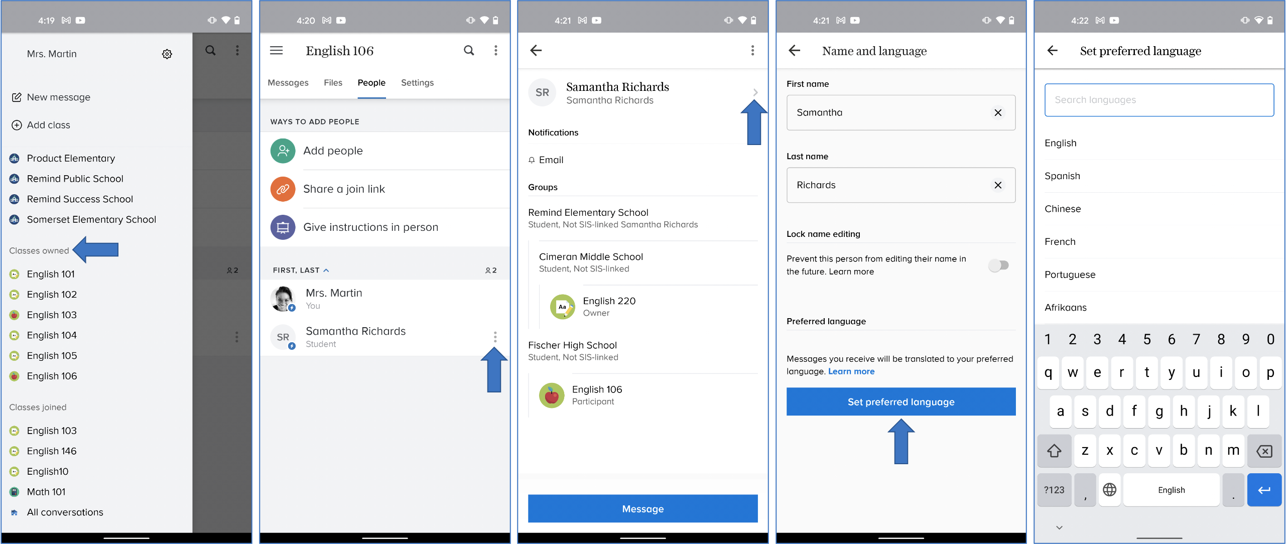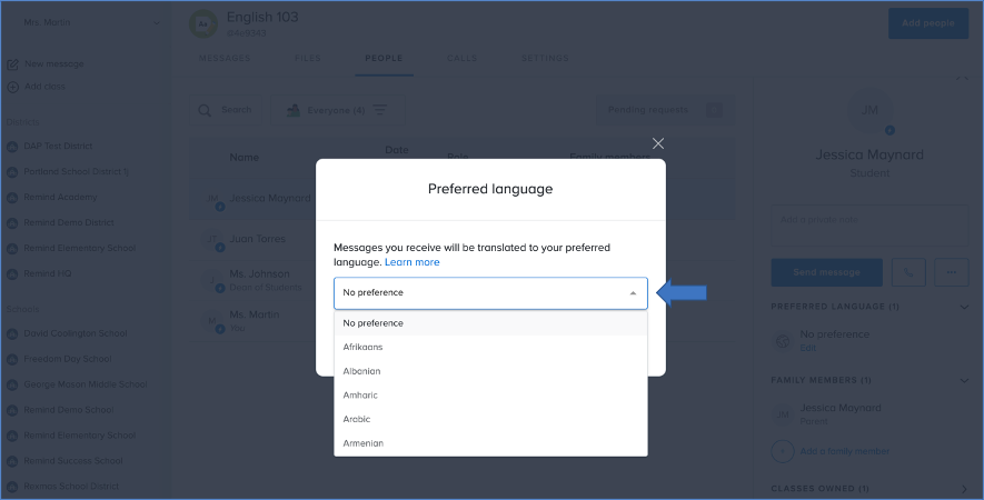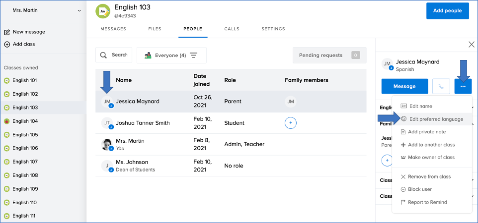 We highly recommend that you view and edit the preferred language for all teachers, parents, and students in your organization or class. The default preferred language for all Remind accounts is blank.