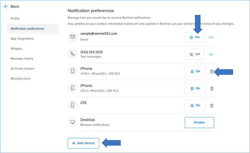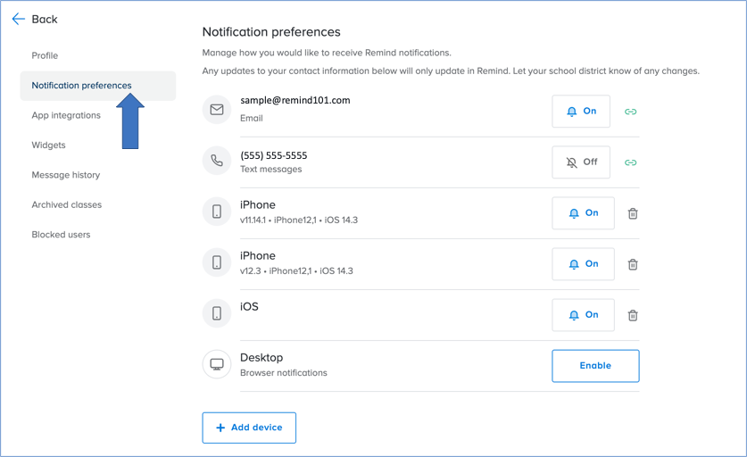 Puede agregar, eliminar o editar su número de teléfono celular y dirección de correo electrónico, así como ajustar su aplicación y notificaciones de escritorio a través de su panel de Remind.