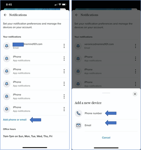 - Haga clic en Agregar teléfono o correo electrónico para conectar otro dispositivo a su cuenta de Remind.