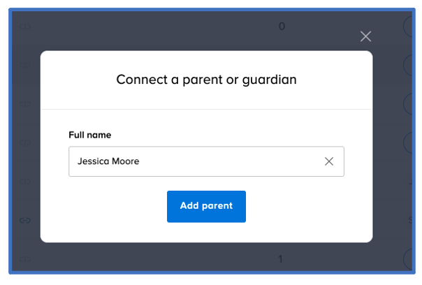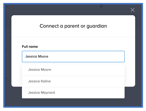 - Enter the parent or guardian's full name in the pop-up box.Note 1: If you do not see a parent or guardian listed in the pop-up box, click the X at the top right corner, and manually add a parent or guardian by following step 3 in How to add people to a class or school.Note 2: Once you’ve added the parent or guardian to the class or school, repeat steps 2- 5 to connect another parent or guardian to a student.