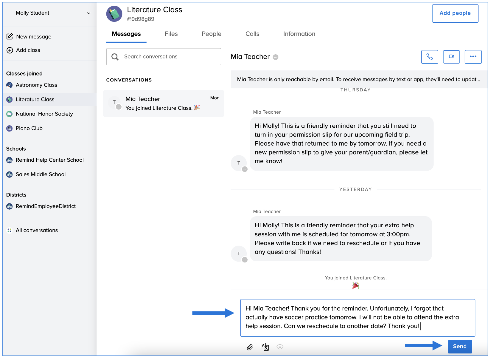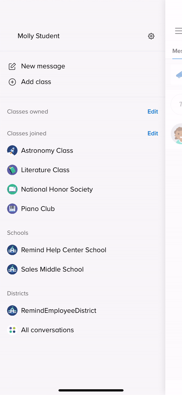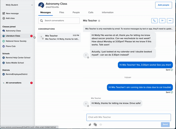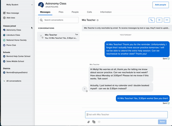 You can send messages to your teachers and/or school administrators on Remind if they have replies enabled. Reach out to your teachers with questions you have about homework assignments, or send messages to your administrators about upcoming events.