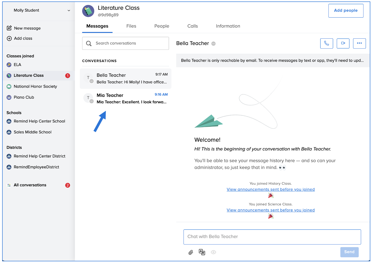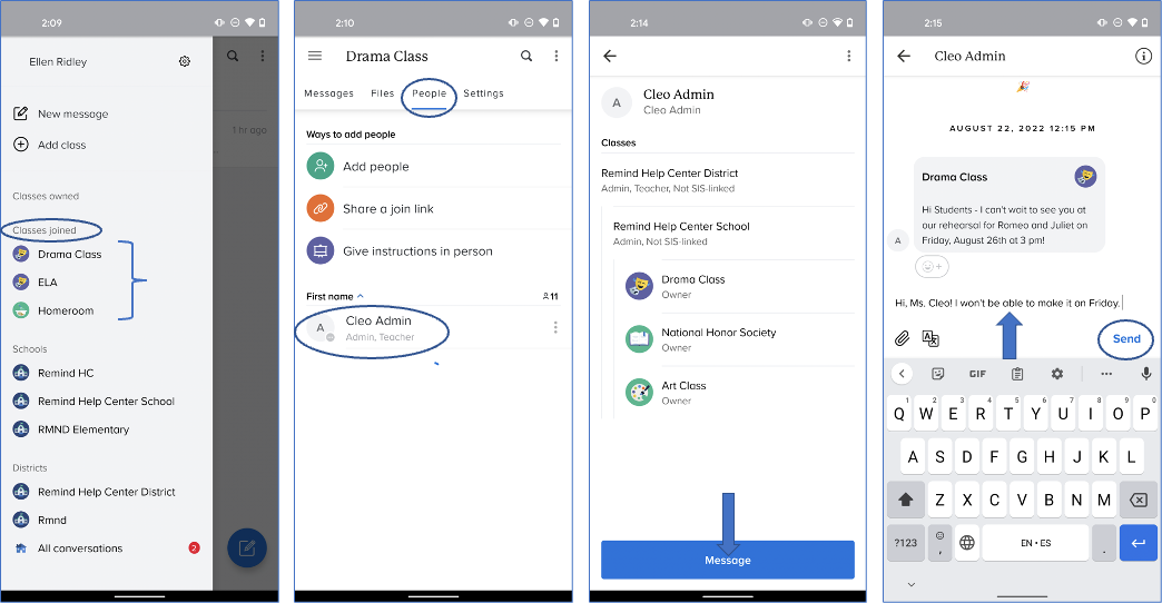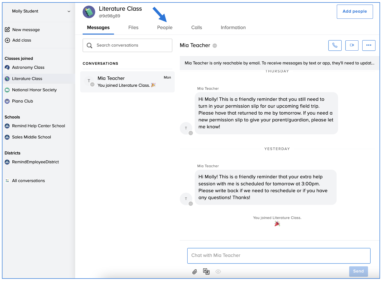 - Send a message to your teacher or administrator from the People list (for Remind Hub users only)