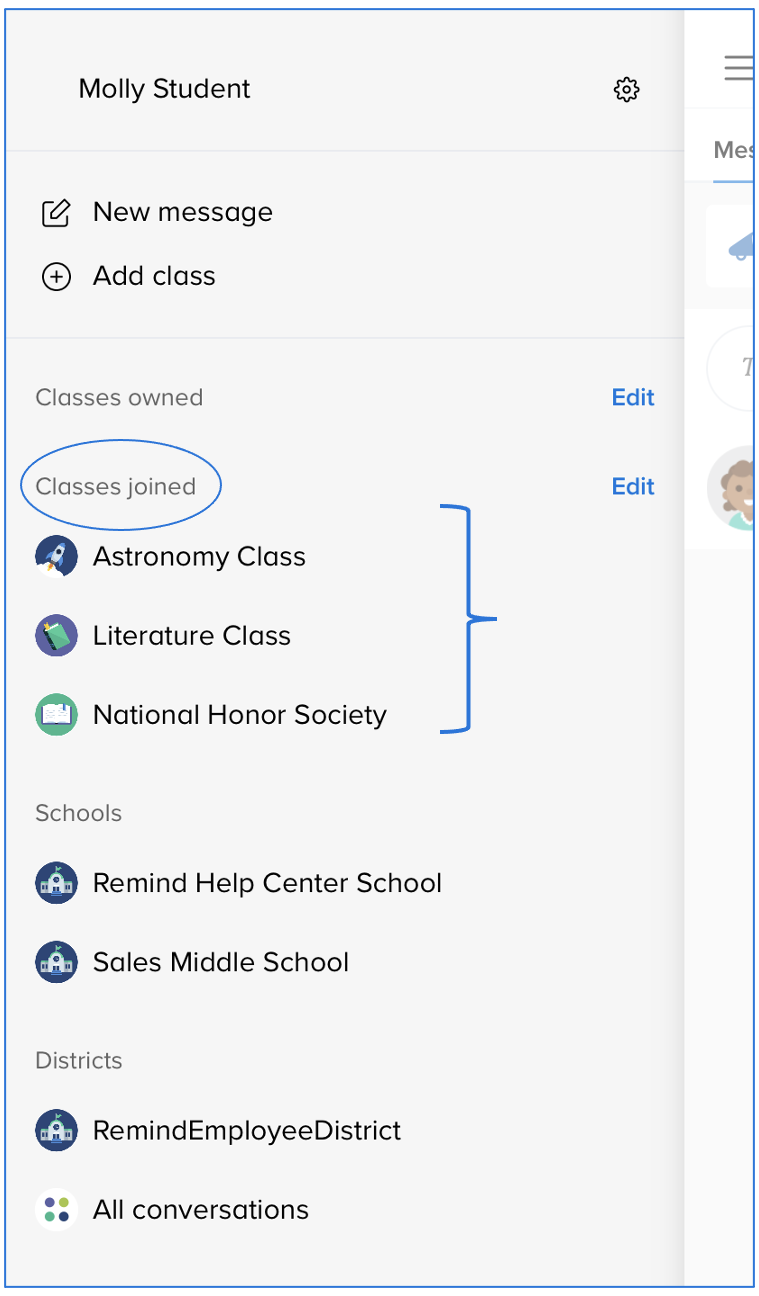 - Select the class for the teacher or administrator you want to send the message under Classes joined. This will take you to the main class page.